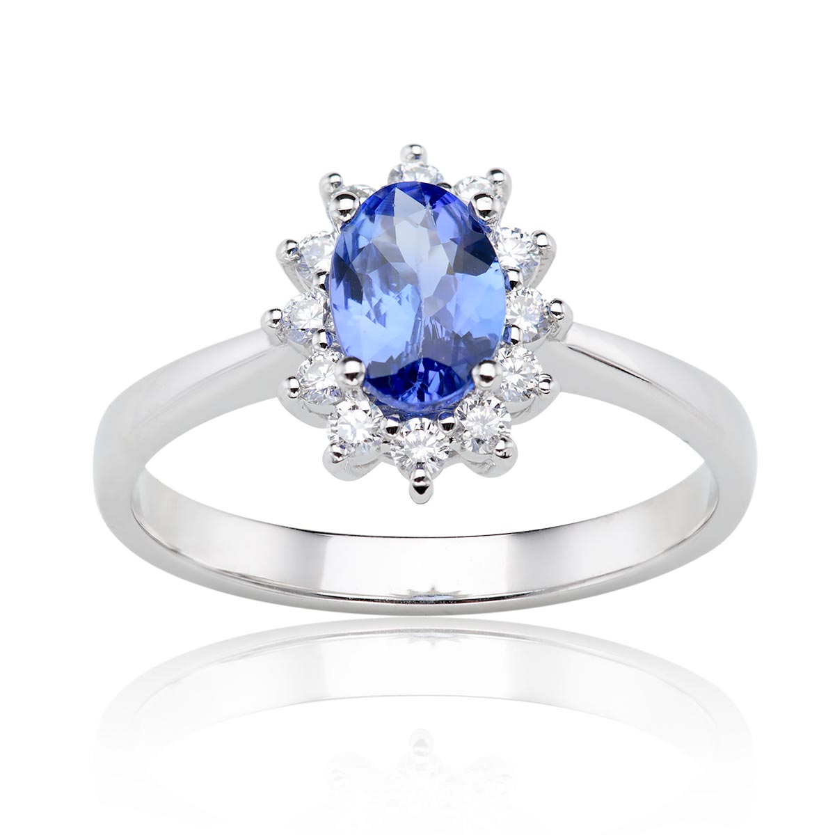 Pierścionek z białego złota z przepięknym tanzanitem otoczonym dwunastoma brylantami o łącznej masie 0,25 ct . Barwa - biała - H , czystość - VS . Waga pierścionka ok. 3,10g , próba złota 585. Tanzanit wysokiej jakości o wymiarach 5,00mm x 7,00mm. Serce mięknie razem z nogami na widok tego pierścionka - jest po prostu urzekający ! Fioletowo-niebieska piękność, biel brylantów i złota - to musi być VIOLETTE,