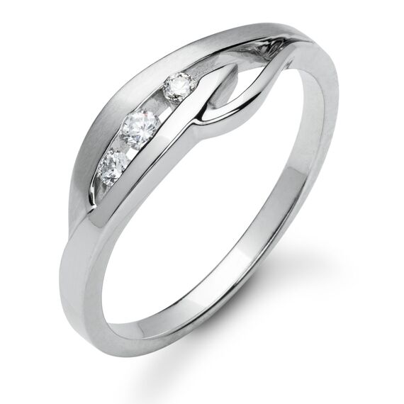 Oryginalny i nowoczesny pierścionek z białego, polerowanego złota próby 585 z trzema brylantami 0,09 ct H/Si. Powierzchnia dodatkowo rodowana. Błyskotliwy podarunek dla ukochanej. Oryginalny wzór na zaręczyny.
