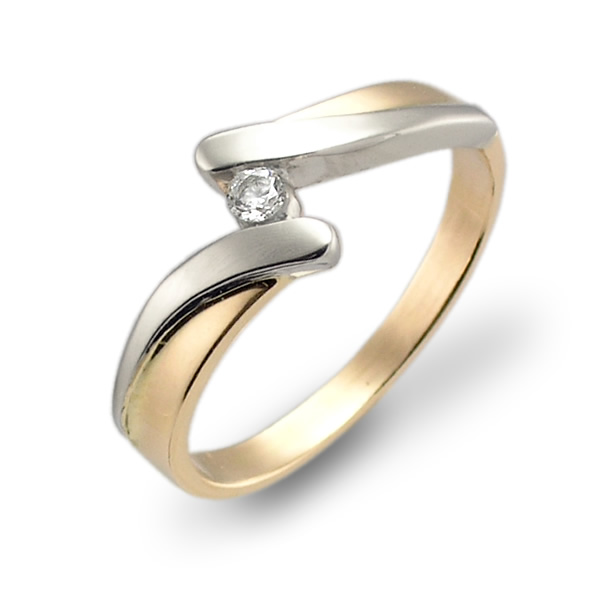 Pierścionek z żółtego złota z ciekawie oprawionym brylantem. Elementy przy kamieniu wykonane z białego złota, rozświetlają go i nadają niepowtarzalny urok. Całość idealnie polerowana. Niezwykły model na zaręczyny. Jego delikatność, barwa i blask zachwyci każdą kobietę, zapewniamy że odpowie "TAK". Złoto 585 - żółte/białe,brylant 0,07ct., barwa :H, czystość: VS2.