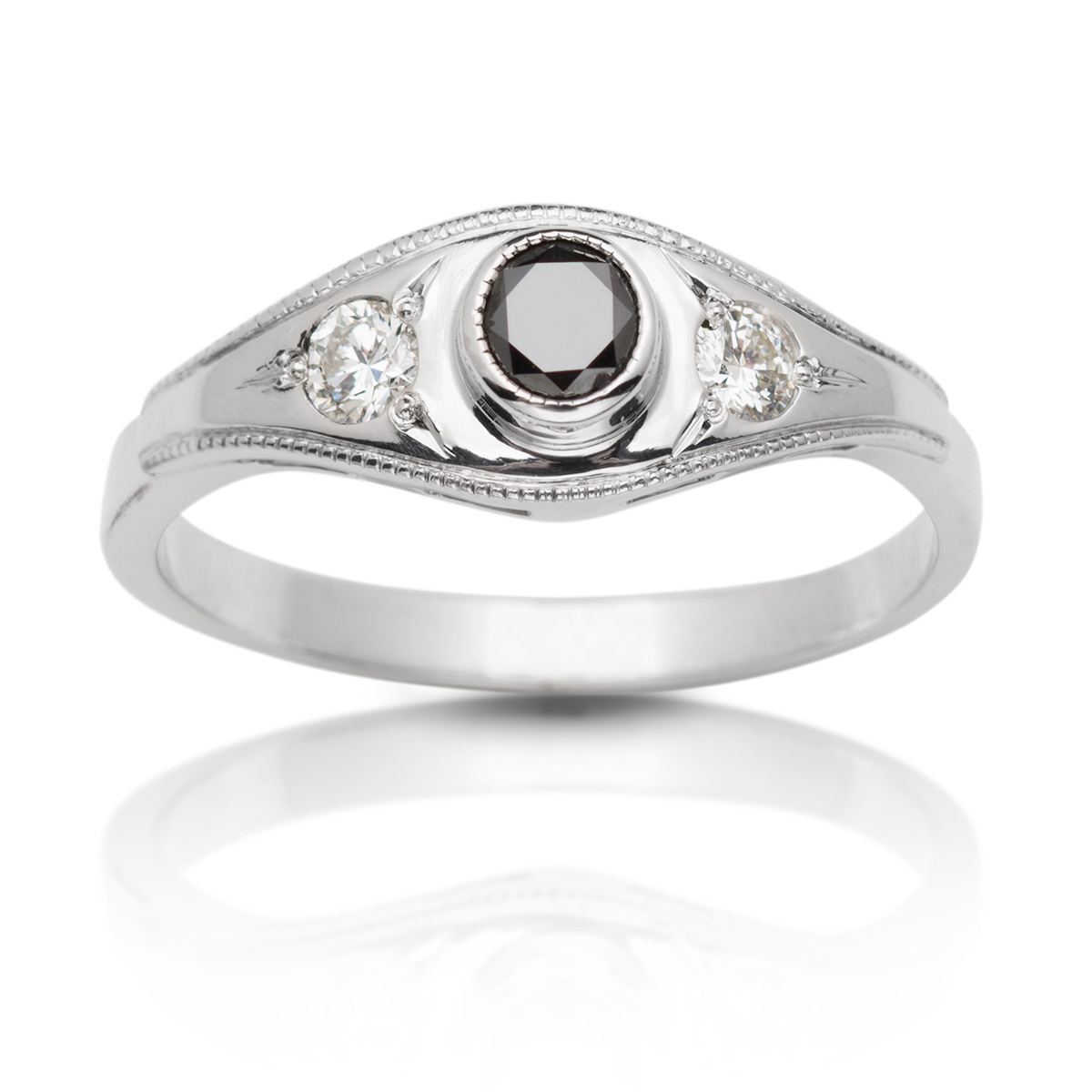 Bardzo oryginalny pierścionek wykonany z białego złota 585. Centralny kamień to niezwykły czarny diament 0,17 ct rozświetlony po bokach dwoma brylantami łącznie 0,07 ct H/VS. Niezwykłe połączenie bieli z czernią!!! Idealny na zaręczyny i nie tylko!!!