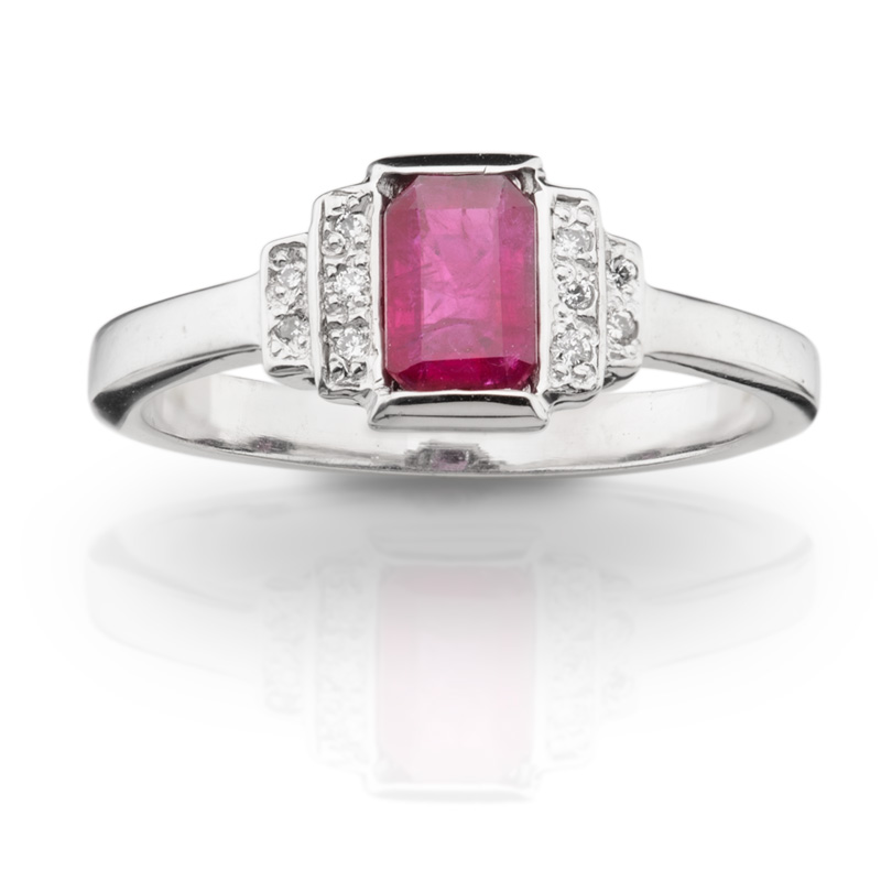 Pierścionek z białego, polerowanego złota z pięknym, dużym rubinem 6mm na 4 mm i dziesięcioma maleńkimi brylantami. Powierzchnia złota rodowana. Prosty i oryginalny wzór, dla osób ceniących nowoczesność. Złoto próby 585 , waga pierścionka ok. 2,7 g.