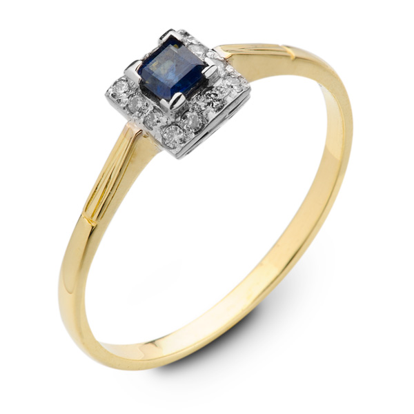 Pierścionek z żółtego, polerowanego złota z kwadratowym szafirem i brylantami. Delikatny i klasyczny wzór idealny na zaręczyny i nie tylko...