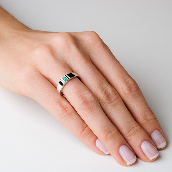 Pierścionek z białego, polerowanego złota z kwadratowym szmaragdem i dziesięcioma maleńkimi brylantami. Powierzchnia złota rodowana. Prosty i oryginalny wzór, dla osób ceniących nowoczesność. Szmaragd jest symbolem siły, wewnętrznego szczęścia i witalności. Kamień idealnie pasuje do pierścionka zaręczynowego. Złoto próby 585, szmaragd o wymiarach 3mm x 3mm,po boku zdobiony dziesięcioma brylantami o łącznej masie razem 0,06 ct H/SI. Waga pierścionka: 3,2 g.